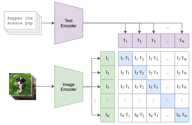 基本的には、画像とその中身を説明したテキストのペアを用意して、上記Encoderとなっている特徴抽出器を学習させていきますが、重要なポイントは、右側のマトリックスの部分です。これは、すべての画像とテキストのコサイン類似度を計算したマトリックスになっており、正しい画像とテキストのペアの類似度が対角成分(上記青色部)に来るように、配置計算をします。