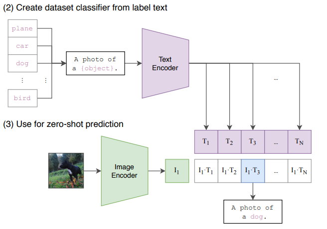 上記図の場合、入力は犬の画像と、N個のテキストの文字列になります。テキストの例としては[A photo of a plane, A photo of a car, A photo of a dog, ...]というように、文字列のリストが入力になっています。それぞれの入力は特徴抽出器(上記Encoder)に入れられ、特徴ベクトルに変換されます。そしてその出力の内積を取り、コサイン類似度を計算することで、それぞれのテキストと画像の類似度を1.0 から -1.0のスコアで出力します。これが基本的なCLIPの仕様になります。